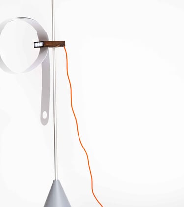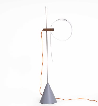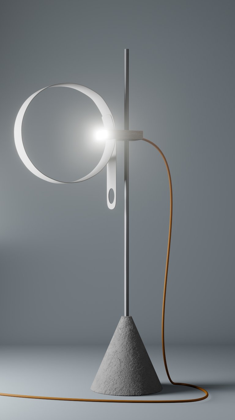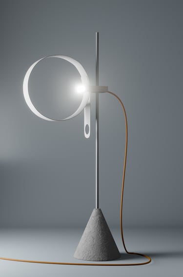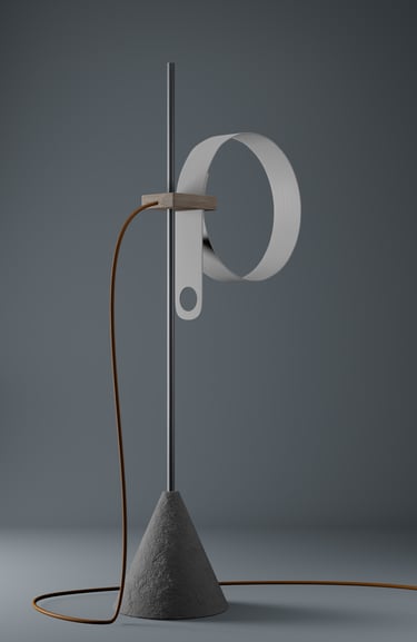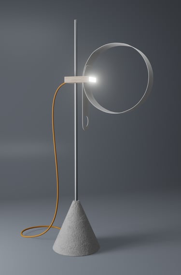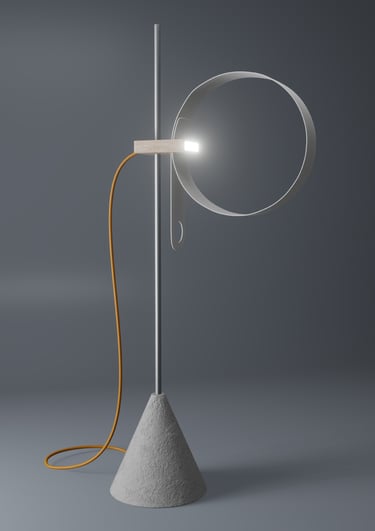 Conceived as both sculpture and tool, Elepsio draws inspiration from raw, elemental materials. The tactile interplay of concrete, aluminum, wood and plastic invites touch and curiosity. A bold orange power cable arcs from the wooden block, a functional vein of energy and a deliberate burst of color. Through its bold forms and careful craftsmanship, Elepsio finds balance between expressive artistry, precise engineering, and practical utility, illuminating its surroundings while exuding quiet sculptural beauty.