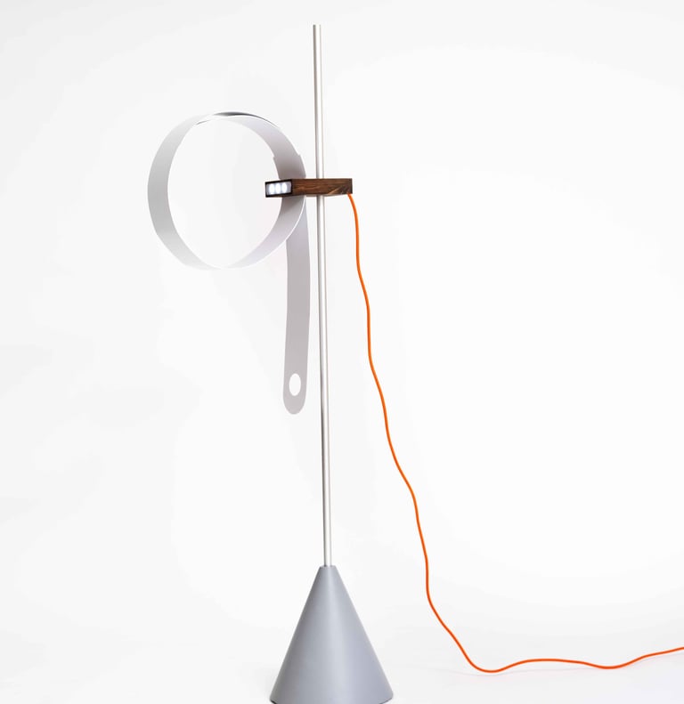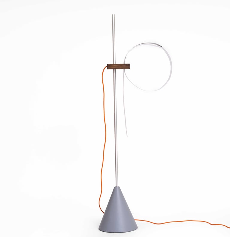 A continuous plastic strip emerges through a subtle groove in the wooden block and loops around the light source to create the lampshade. As the strip is drawn tighter or loosened, the ring of light expands or contracts, intuitively adjusting brightness and beam spread. This transformative loop—shifting from a flat ribbon into a full circle—makes the lampshade itself a dynamic element of the design. The entire wooden module can slide up and down the vertical rod, changing the lamp’s height and presence in space with simple movement.